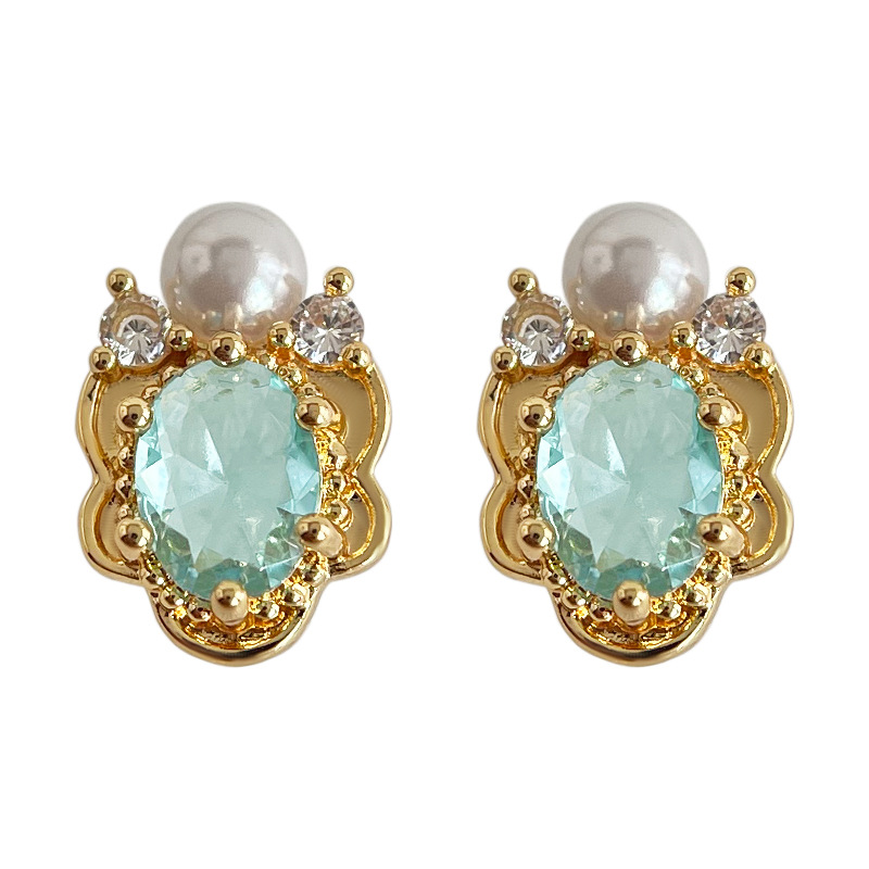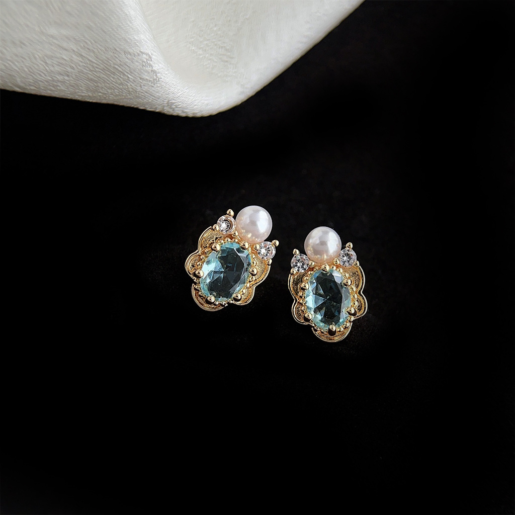 海藍寶鍍 14K 金珍珠耳釘|微鑲鋯石 文青復古通勤質感