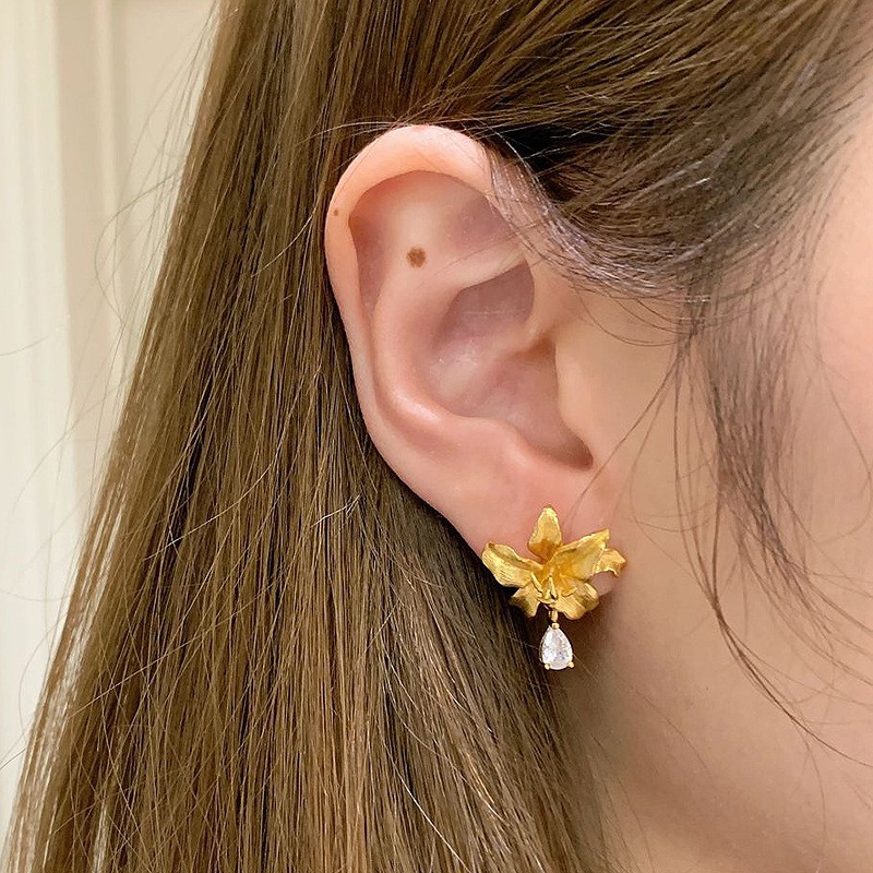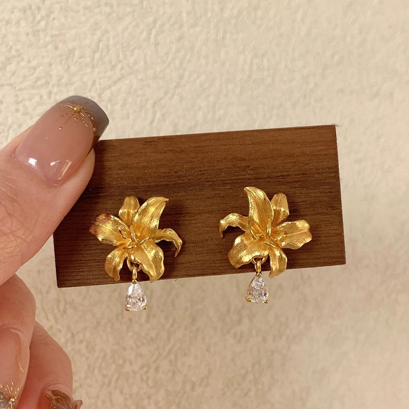 金色古法拉絲百合水滴耳釘 復古質感款