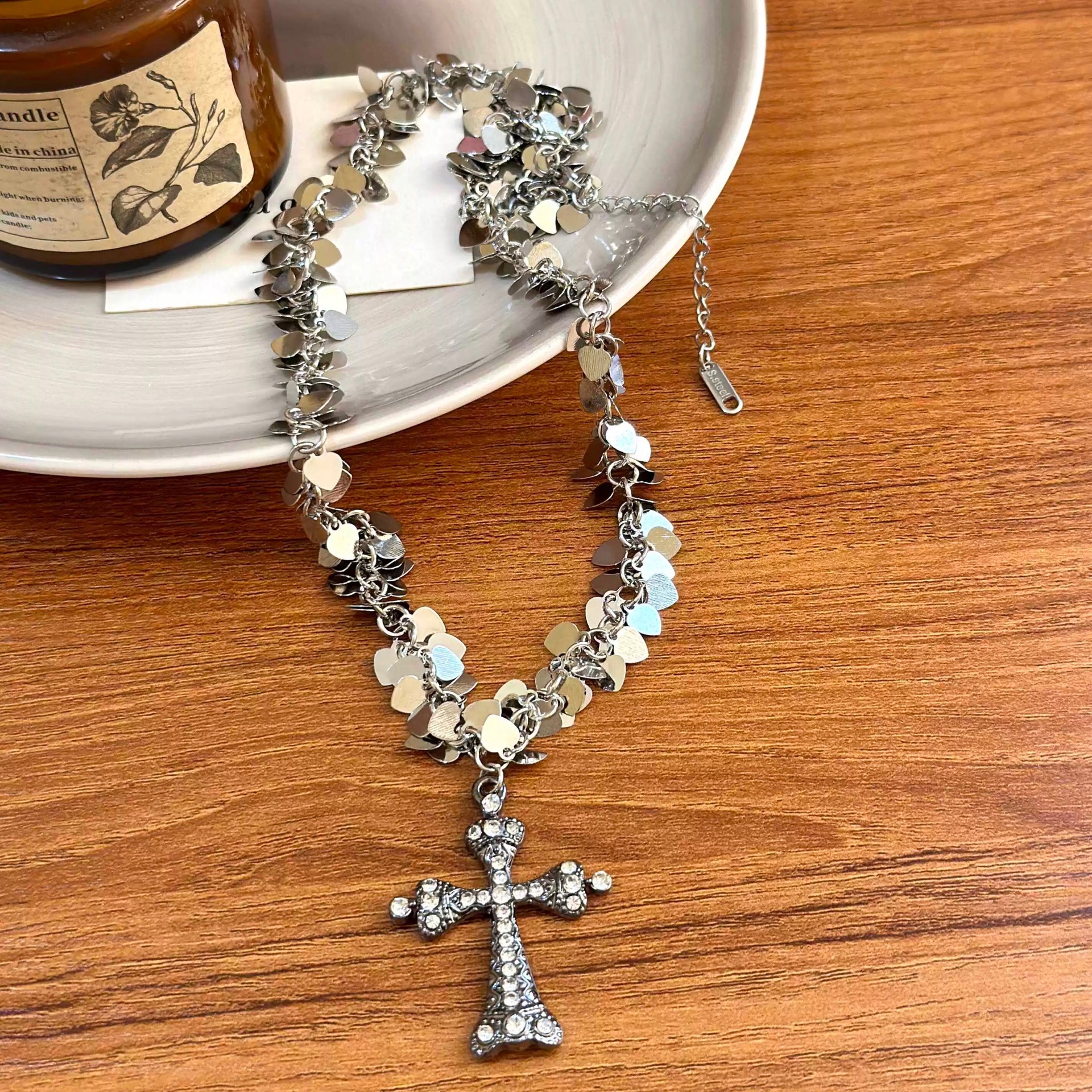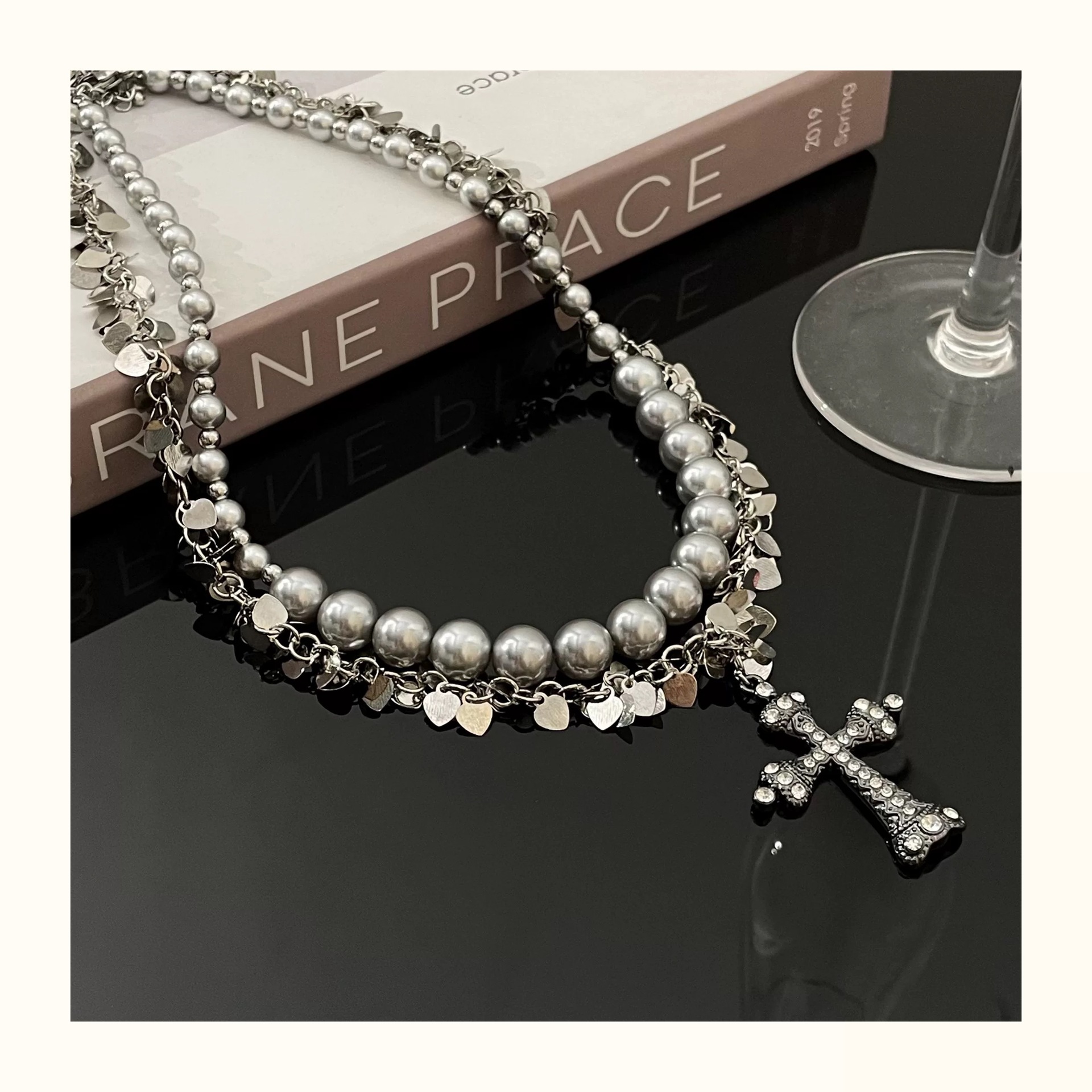 重工雙層十字架亮色愛心珍珠鏈|嘻哈朋克風男女同款小眾高級鎖骨鍊