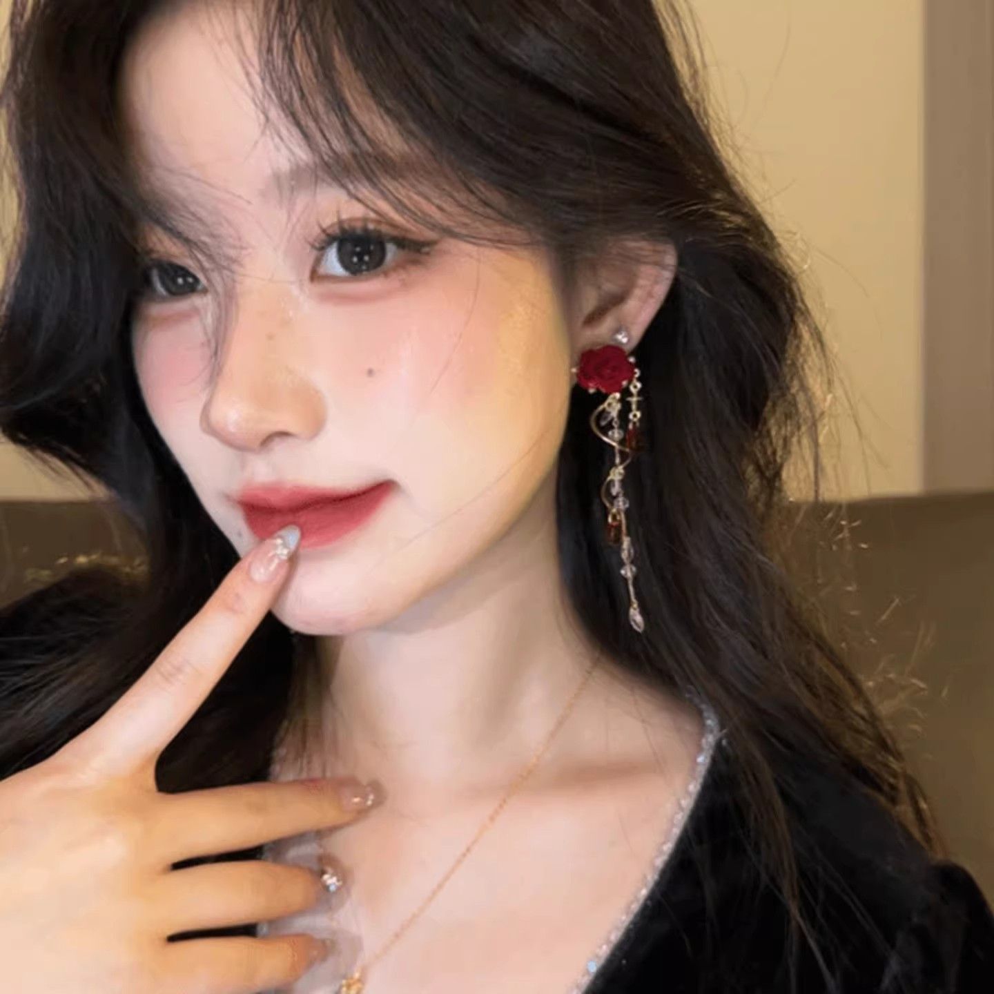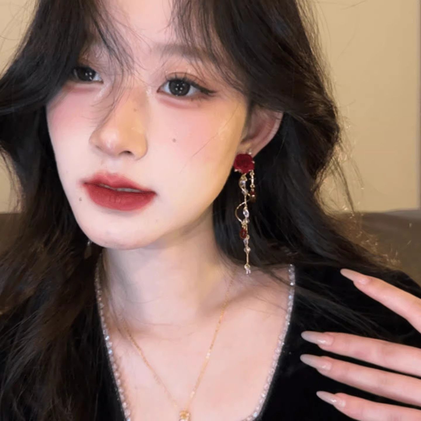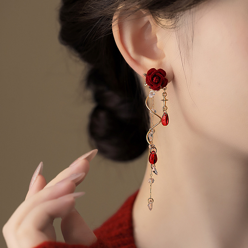 植絨紅玫瑰流蘇耳飾|仙氣溫柔水鑽耳環